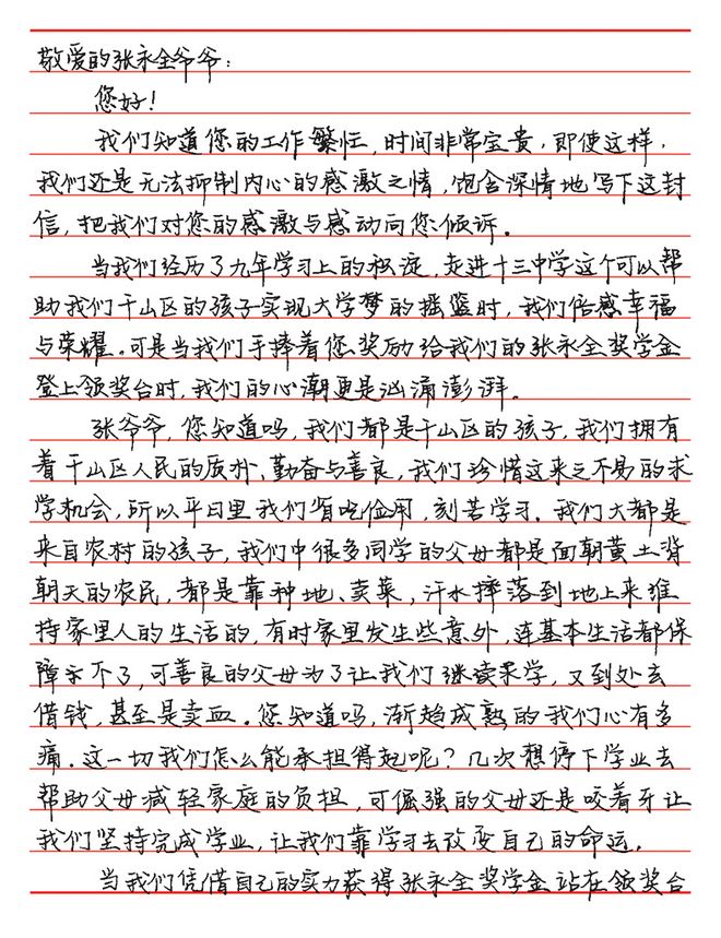 鞍山市第十三中學受資助學生的來信