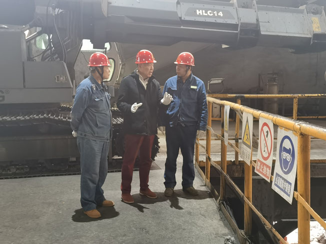 董事長(左二)在煉鋼廠檢修現(xiàn)場視察,公司副總調(diào)度長李成哲(左一)、煉鋼廠廠長閆海龍(右一)等主要領(lǐng)導(dǎo)全程陪同